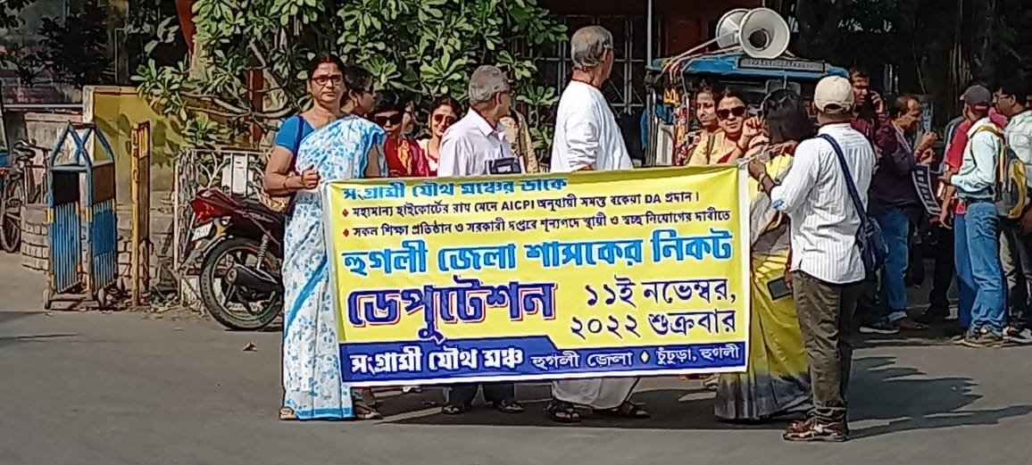 বন্দনা ভট্টাচার্য, হুগলি : হাই কোর্টের নির্দেশে অবিলম্বে সকল বকেয়া ডি এ প্রদান ও শিক্ষা প্রতিষ্ঠান এবং সকল সরকারী শূন্য পদে স্বচ্ছ ভাবে স্থায়ী নিয়োগ করতে হবে,এই দুই দফা দাবিতে সংগ্রামী যৌথ মঞ্চের পক্ষ থেকে শুক্রবার হুগলী জেলার জেলাশাসকের কাছে একটি ডেপুটেশন জমা করা হয়। সাংগঠনিকভাবে হুগলীর পিপুলপাতির মোড় থেকে একটি মিছিল করা হয়। মিছিলটি চুঁচুড়ার ঘড়ির মোড় পর্যন্ত আসে। এই মিছিলে রাজ্যে সরকারি কর্মচারী, শিক্ষাকর্মী, শিক্ষক, লাইব্রেরীয়ান, ডাক্তার, নার্স, সহ প্রায় সাতাশটি বিভিন্ন সংগঠনের প্রায় শতাধিক মানুষ এই মিছিলে পা মেলান। মিছিলটি ঘড়ির মোড়ে পৌছানোর পর কিছু সময় তারা সেখানে বিক্ষোভ দেখান। অবশেষে জেলা শাসকের দপ্তরে ডেপুটেশন জমা করেন।
