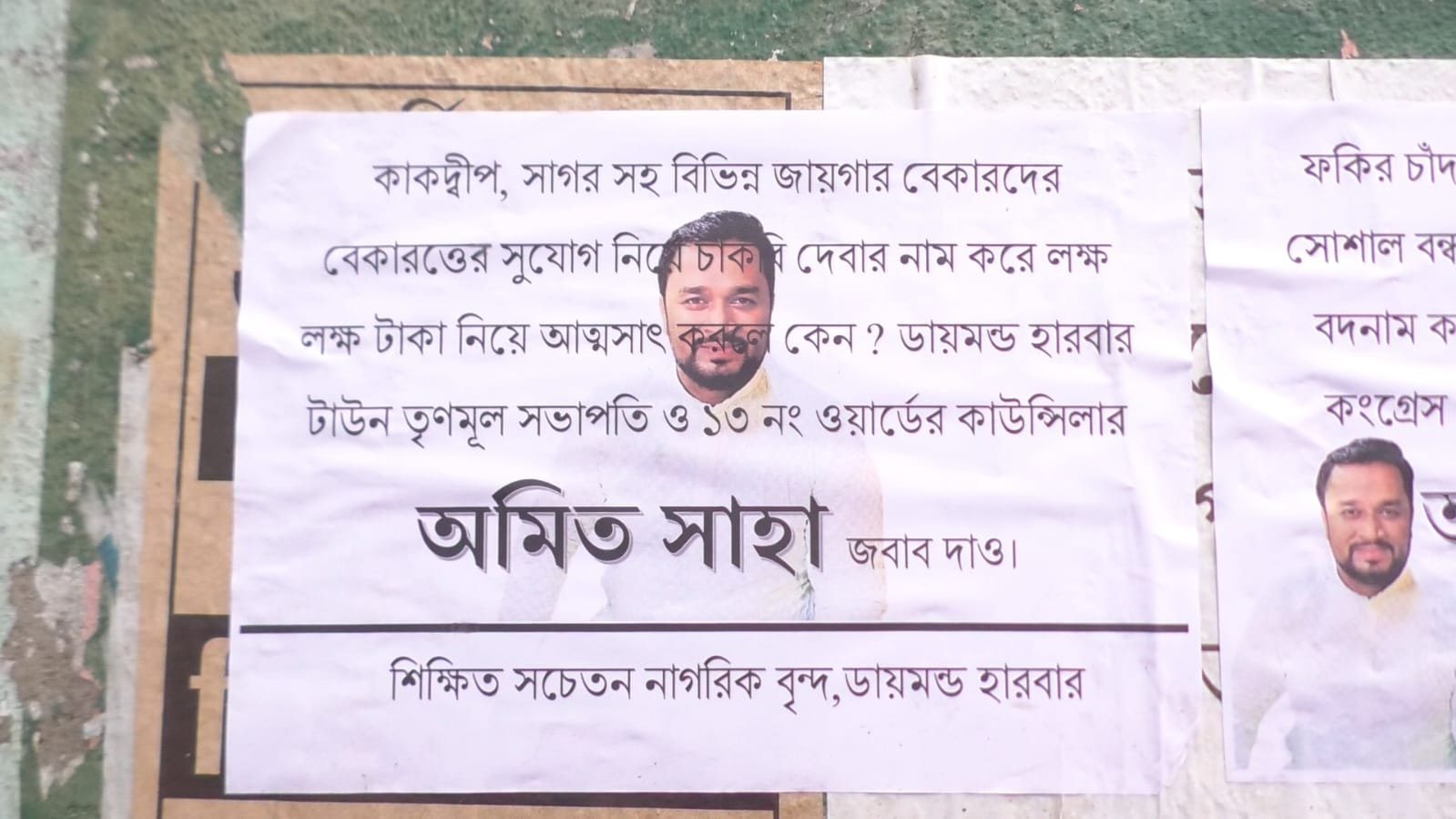 নিজস্ব সংবাদদাতা, ডায়মন্ডহারবার : ডায়মন্ড হারবার পুরসভার ১৩ নম্বর ওয়ার্ডের তৃণমূল কাউন্সিলার তথা দলের টাউন সভাপতি অমিত সাহার বিরুদ্ধে শহরের একাধিক এলাকায় পড়ল পোস্টার। এসএসসি গ্রুপ- সি পদে চাকরি খোয়ানোর তালিকায় নাম রয়েছে অমিতের। আদালতের নির্দেশে তালিকা প্রকাশের পর থেকে গত ১০ই মার্চ থেকে বেপাত্তা অমিত। ওইদিন থেকে পুরসভায়, জনসংযোগ কার্যালয় ও বাড়িতে পাওয়া যায়নি অমিতকে। বৃহস্পতিবার সাতসকালে পুরসভা চত্বর, ১৩ নম্বর ওয়ার্ডের জলট্যাঙ্ক পাড়ায় অমিতের ছবি দিয়ে দুর্নীতি নিয়ে একাধিক পোস্টার পড়েছে। সেই পোস্টারগুলিতে বোআইনীভাবে চাকরি চুরি, ফকিরচাঁদ কলেজে সোশ্যালের টাকা তছরুপ ও নাগরিক পরিষেবা ব্যহত হওয়ার অভিযোগ তোলা হয়েছে। ফকিরচাঁদ কলেজের ছাত্রী বৃন্দ, শিক্ষিত সচেতন নাগরিক বৃন্দ ও ১৩ নং ওয়ার্ডের নাগরিকবৃন্দের পক্ষ থেকে এই পোস্টার দেওয়া হয়েছে বলে জানাগেছে। এই পোস্টার ঘিরে রাজনৈতিক সরগরম ডায়মন্ড হারবার। তবে এদিনও সকালে গিয়ে অমিতকে বাড়িতে পাওয়া যায়নি। পরিবারের পক্ষ থেকে জানানো হয়েছে, অমিতের বাবা খুবই অসুস্থ। পরিবারের কেউ কথা বলতে রাজি হননি। অমিত ফোনও ধরেন নি।